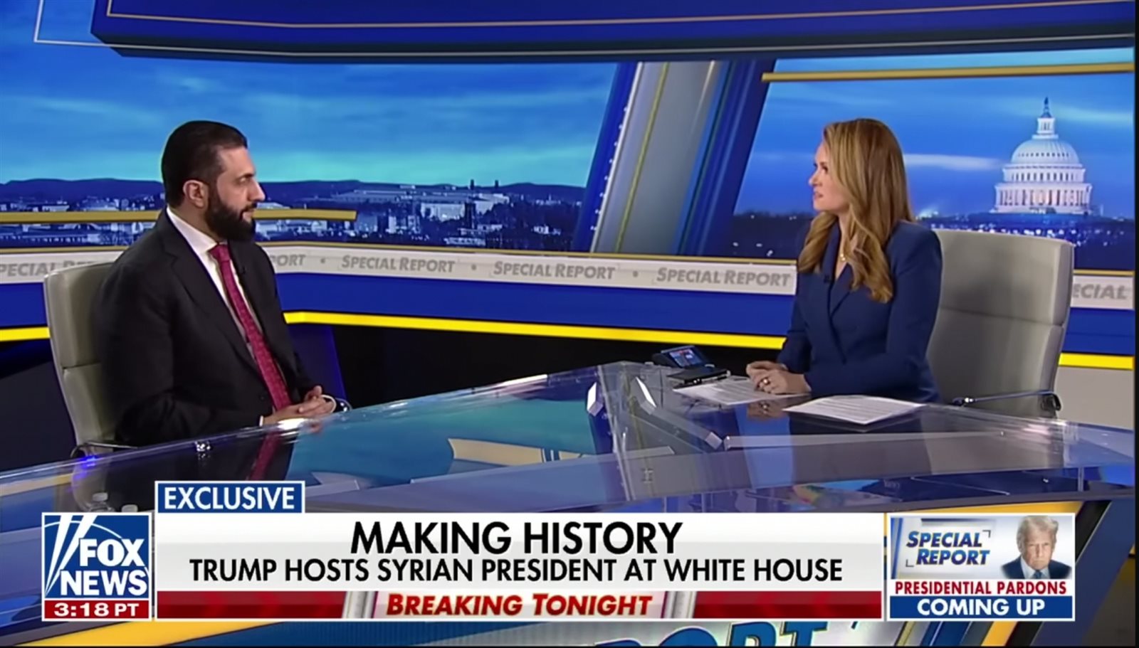 أجريت قناة Fox News الأمريكية حوار مدته 8 دقائق مع الرئيس السوري أحمد الشرع، وذلك بعد أن اختتم لقاءه مع الرئيس الأمريكي دونالد ترامب في البيت الأبيض الذي أبدى خلالها إعجابه الشديد بالشرع ومتوقعاً بأنه سيحقق "الازدهار" في البلاد التي شهدت 14 عاماً من الخراب والدمار نتيجة الحرب الأهلية.