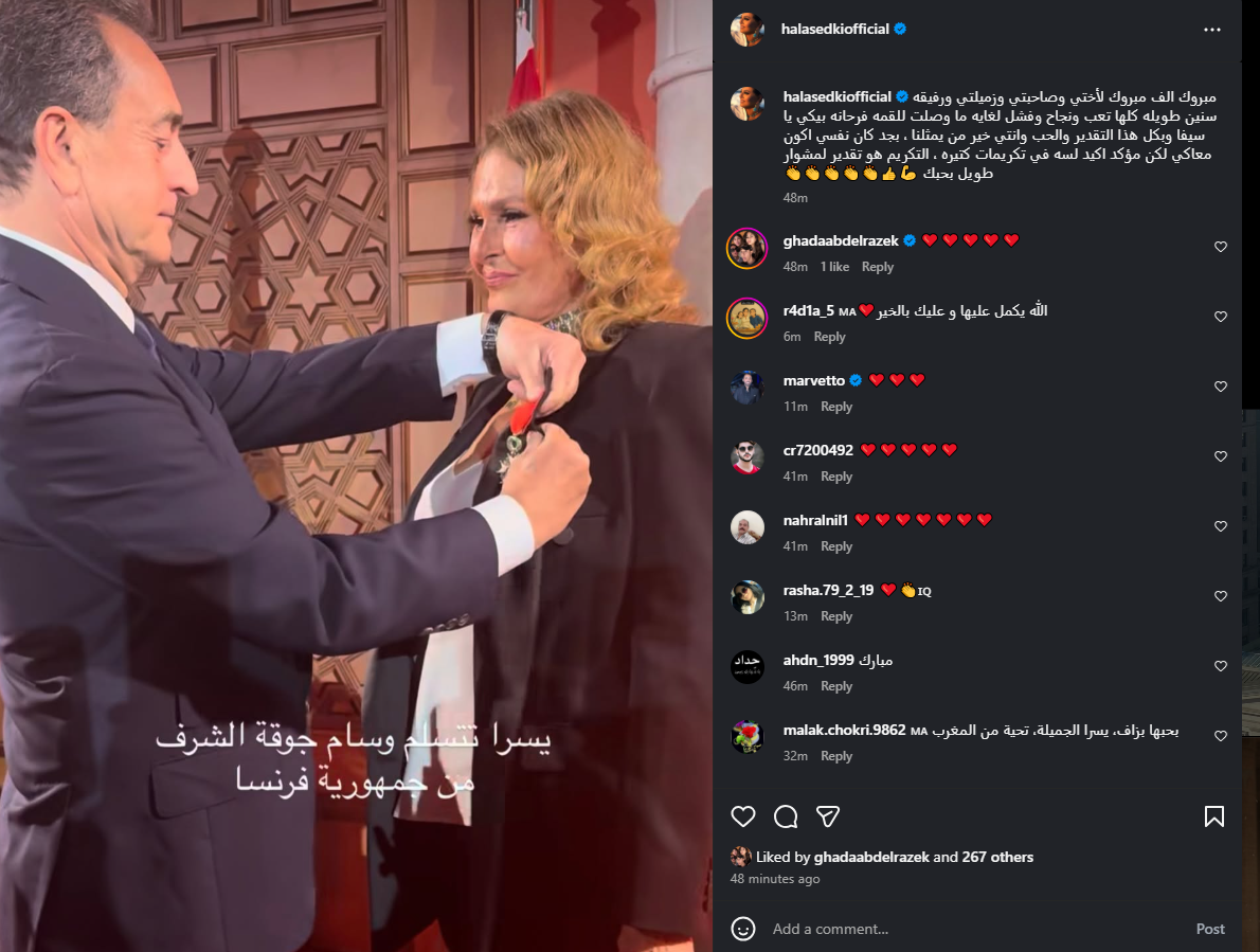 مبروك لأختي ورفيقة السنين.. هالة صدقي تهنئ يسرا بعد منحها وسام جوقة الشرف