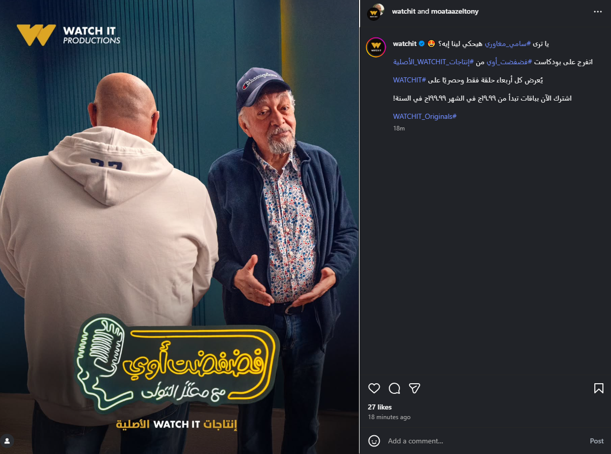 وشاركت منصة watch it، البوستر الرسمي لـ حلقة الفنان سامي مغاوري، وفقا لما رصده موقع تحيا مصر، عبر صفحتها الرسمية على موقع التواصل الاجتماعي إنستجرام وعلقت عليها: يا تري سامي مغاوري، هيحكي لينا ايه، اتفرج على بودكاست فضفضت أوي من إنتاجات watch it الاصلية، يعرض كل أربعاء حلقة فقط وحصريا على watch it.