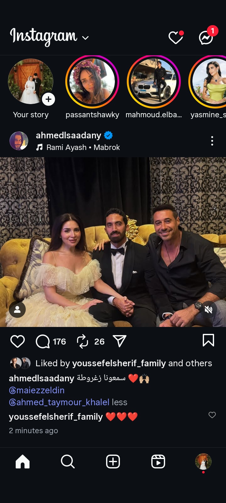 ونشر أحمد السعدني صورة من زفاف مي عز الدين على احمد تيمور على حسابه الرسمي بموقع تبادل الصور والفيديوهات انستجرام، في منشور رصده موقع تحيا مصر، وعلق عليها، قائلا: "سمعونا زغروطة"، وذلك يدل على عمق الصداقة الكبيرة بينهم، حيث يمثلوا أقرب الاصدقاء لبعضهم، حتى أنهم طالتهم شائعات ارتباط من علاقتهم القوية.