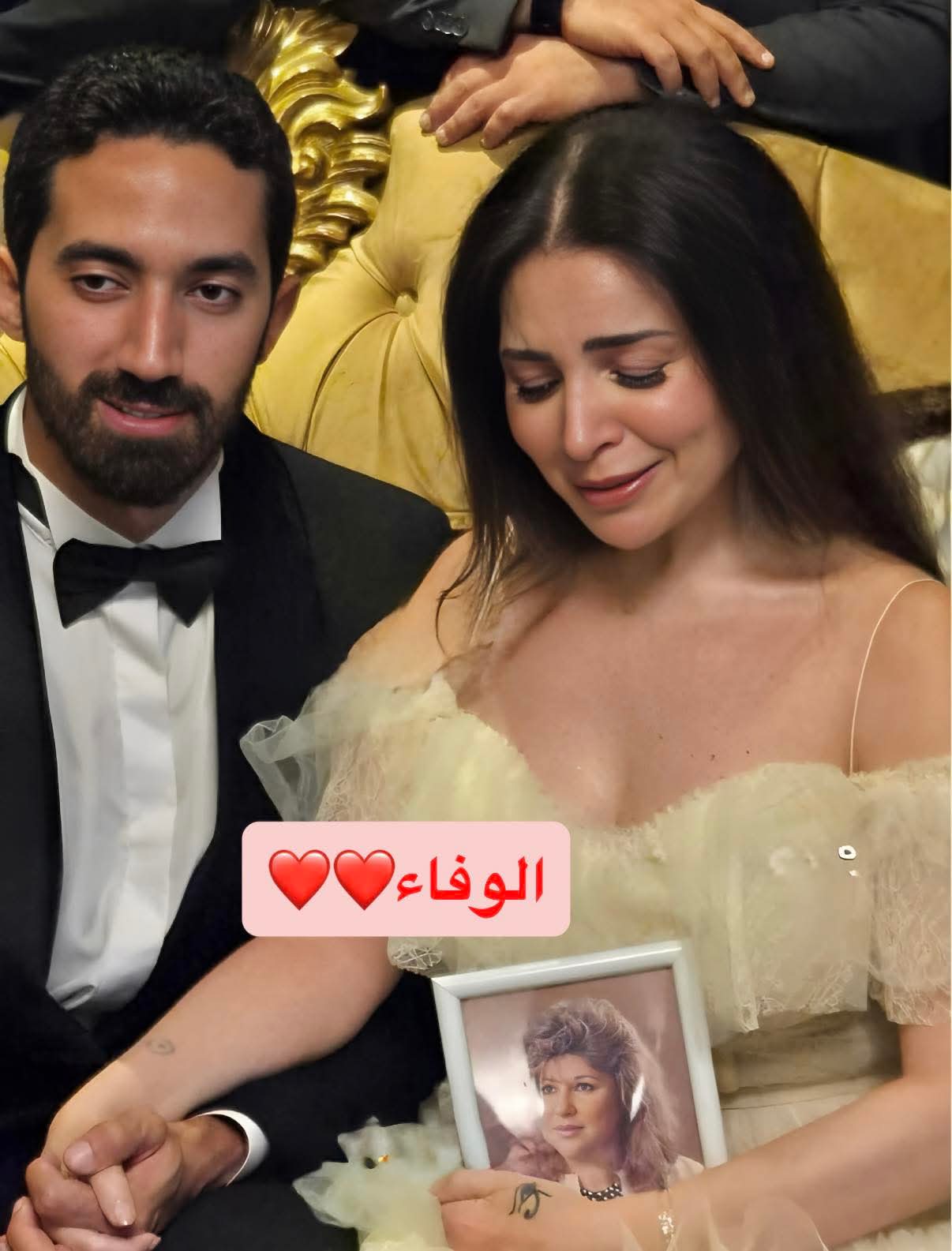 مي عز الدين تحمل صورة والدتها بعقد قرانها
