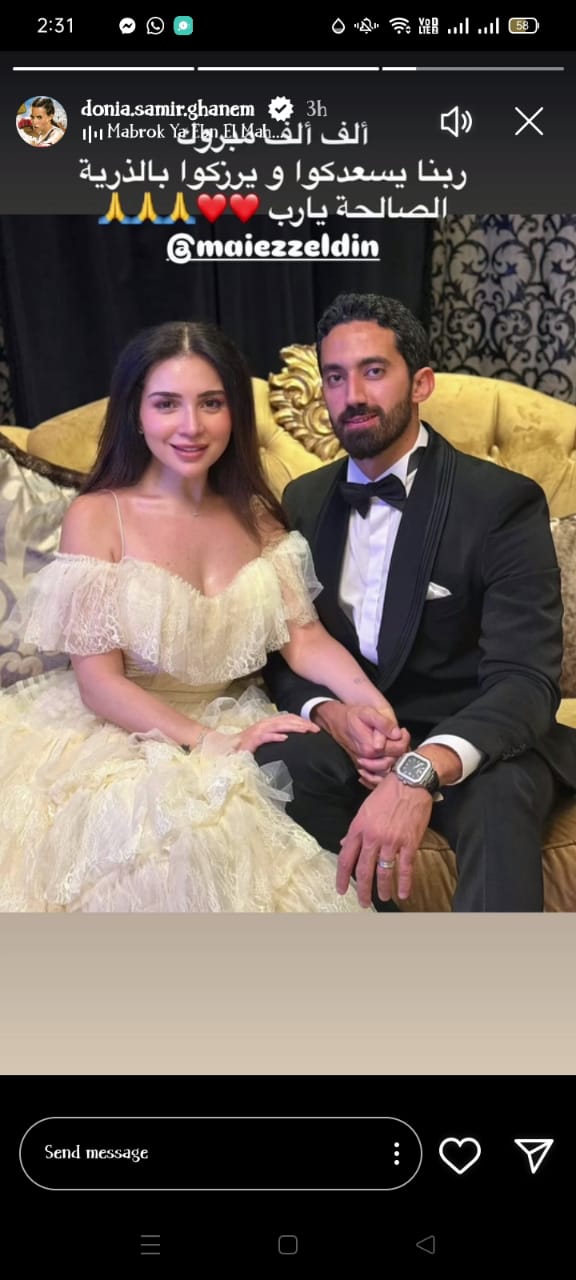 وشاركت الفنانة دنيا سمير غانم، صورة للفنانة مي عز الدين، وزوجها أحمد تيمور، وفقا لما رصده موقع تحيا مصر، وذلك عبر خاصية استوري صفحتها الرسمية على موقع التواصل الاجتماعي إنستجرام وعلقت عليها: ألف ألف مبروك، ربنا يسعدكوا ويرزقوا بالذرية الصالحة.