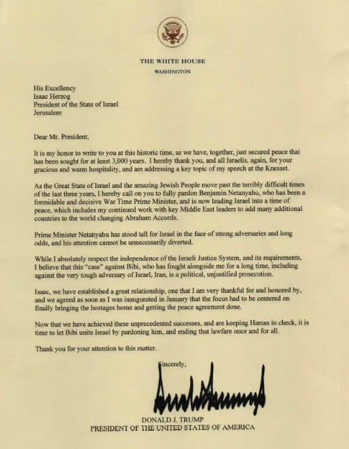 أعلن الرئيس الإسرائيلي إسحاق هرتسوغ أنه تلقى رسالة من الأمريكي الرئيس دونالد ترامب، يطالب فيها منح العفو لرئيس الوزراء بنيامين نتنياهو المتهم في العديد من قضايا تتعلق بالفساد والرشوة، واصفاً هذه المحاكمة أنها لأغراض سياسية موجهة ضد صديقه "بيبي".