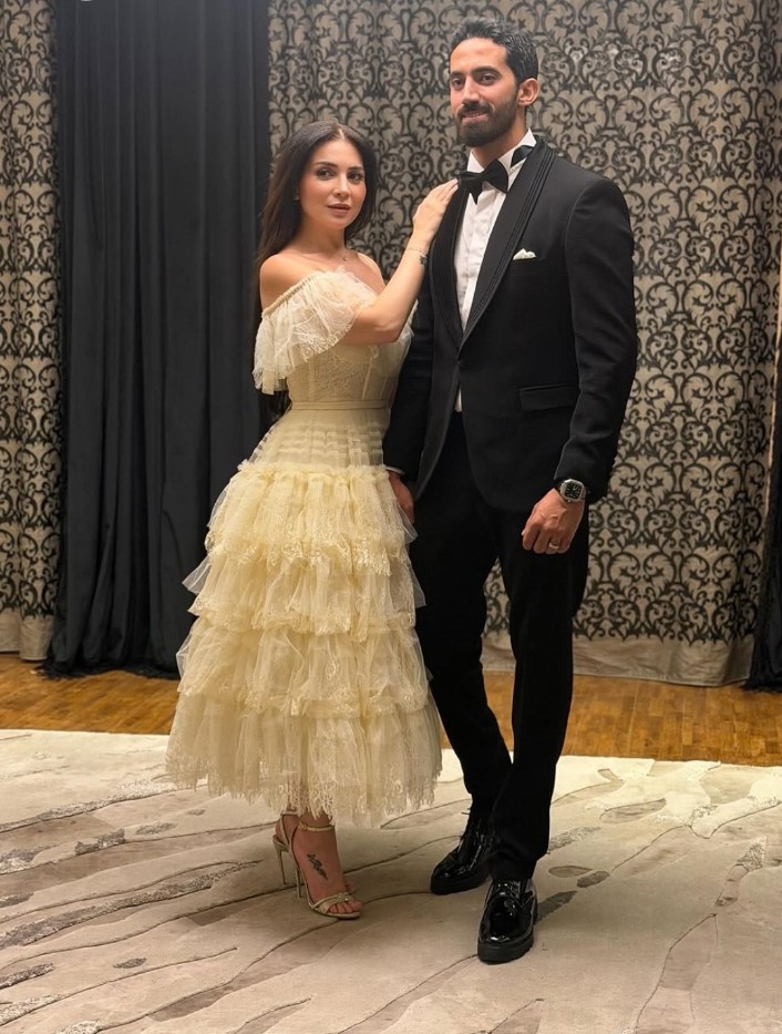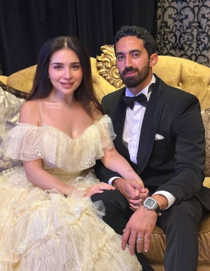 «مليون مبروك لاختي وصديقة مشوار النجاح النجمة الكبيرة مي عز الدين، وأخويا الكابتن أحمد تيمور.. ربنا يسعدكم ويكتبلكم كل الخير».