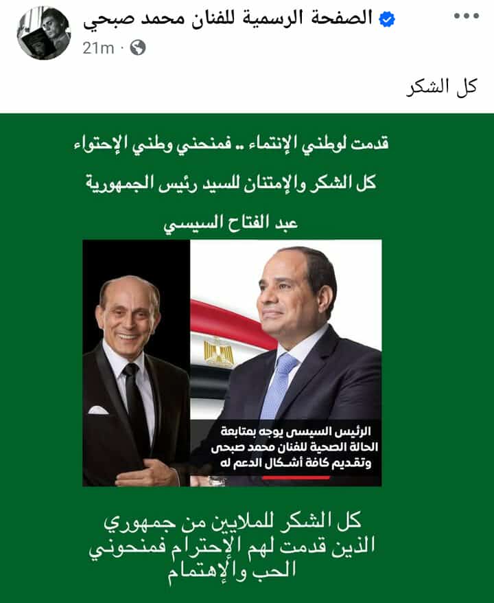 يذكر أنه وجه الرئيس عبد الفتاح السيسي، الدكتور خالد عبد الغفار، نائب رئيس مجلس الوزراء ووزير الصحة والسكان، بمتابعة الحالة الصحية للفنان الكبير محمد صبحي، وتقديم كافة أشكال الدعم الطبي اللازم له، بما يضمن توفير الرعاية الصحية المتكاملة، كما كلّف بإعداد تقرير مفصّل عن الحالة الصحية للفنان، ومتابعة حالته بشكل مستمر.