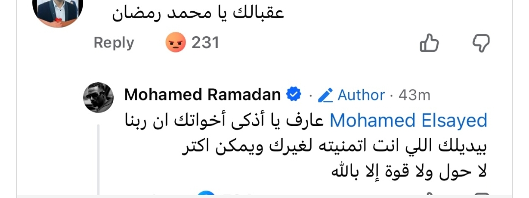 وفاجأ أحد المتابعين محمد رمضان بتعليقًا أثار استغراب الكثيرين ورصده موقع تحيا مصر، قال فيه: "عقبالك يا محمد يا رمضان"، ولم يتجاهل الفنان التعليق، بل ردّ عليه بشكل مباشر قائلًا: "عارف يا أذكى إخواتك إن ربنا بيدّيلك اللي انت اتمنيته لغيرك ويمكن أكتر.. لا حول ولا قوة إلا بالله."