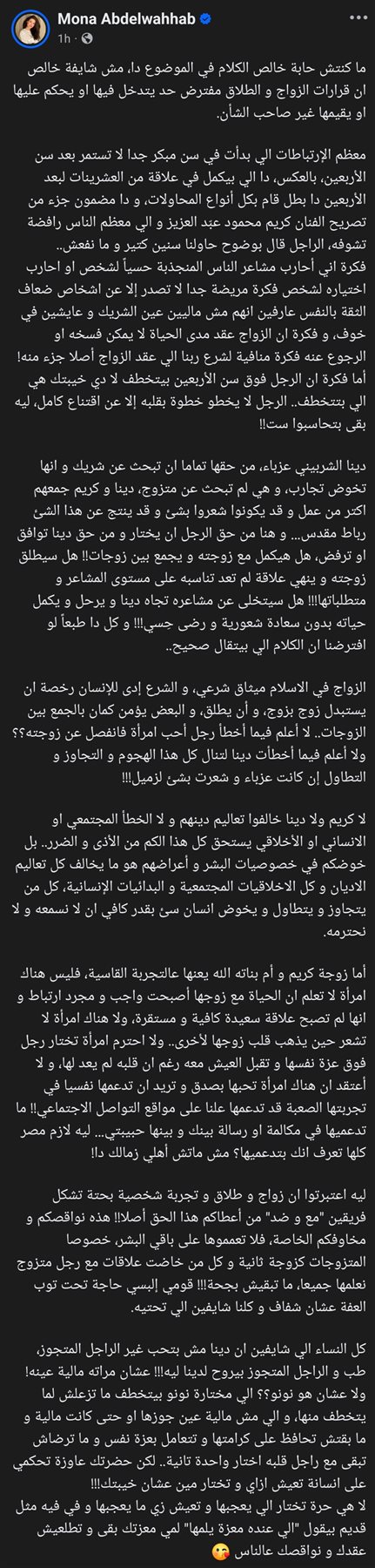 وفي منشورها الذي رصده موقع تحيا مصر عبّرت منى عبد الوهاب عن رفضها لطريقة تناول الجمهور والإعلام لهذه القضية، مؤكدة أن الحياة الشخصية ليست مجالًا للحكم أو التقييم، وقالت عبد الوهاب في بداية حديثها: