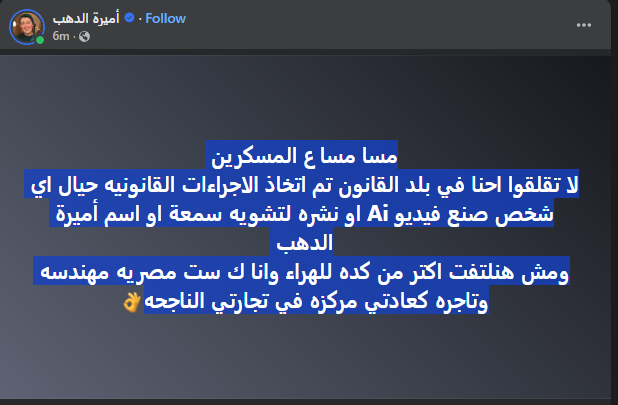 وأكدت أميرة الدهب في منشور لها: “مسا مسا ع المسكرين، لا تقلقوا، إحنا في بلد القانون، تم اتخاذ الإجراءات القانونية حيال أي شخص صنع فيديو AI أو نشره لتشويه سمعة أو اسم أميرة الدهب”. وأضافت أنها لن تلتفت للهراء المثار حولها، مشيرة إلى أنها كمهندسة وكسيدة أعمال مصرية، ما زالت مركزة بالكامل على نجاح تجارتها ومشاريعها في عالم المجوهرات الفاخرة.