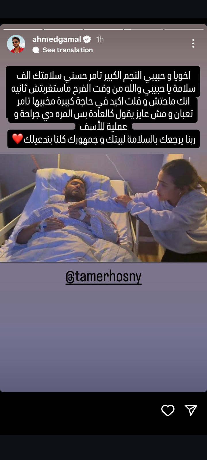 وقال أحمد جمال في منشور رصده موقع تحيا مصر على حسابه الرسمي بموقع التواصل الاجتماعي فيسبوك: ءاخويا و حبيبي النجم الكبير تامر حسني سلامتك الف سلامة يا حبيبي والله من وقت الفرح ماستغربتش ثانيه انك ماجتش و قلت اكيد في حاجة كبيرة مخبيها تامر تعبان و مش عايز يقول كالعادة بس المره دي جراحة و عملية للأسف.. ربنا يرجعك بالسلامة لبيتك و جمهورك كلنا بندعيلك.