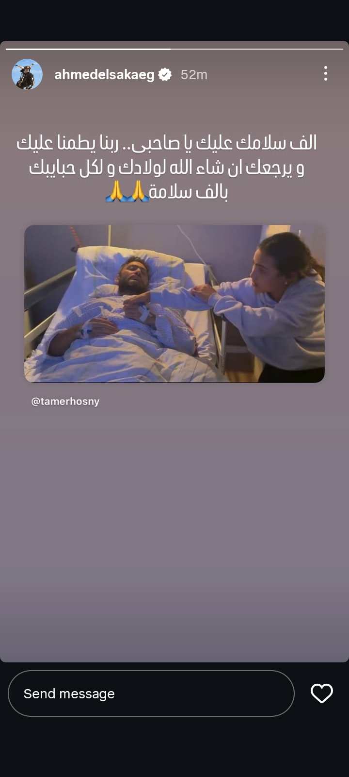 فين حين كتب له الفنان أحمد الشامي: ألف ألف سلامة عليك يا تامر وإن شاء الله تقوم بألف سلامة يارب.
