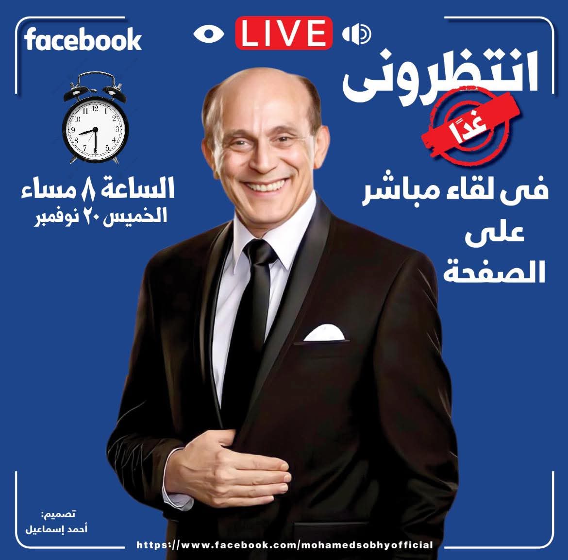 وكتب محمد صبحي في منشور رصده موقع تحيا مصر على حسابه الرسمي بموقع التواصل الاجتماعي فيسبوك: انتظروني غداً الخميس في بث مباشر live علي الصفحة الساعة ٨ مساءً .. في انتظار جمهوري الحبيب.