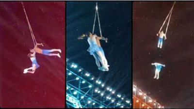 في مشهد مرعب توفت مجازفة صينية علي الفور إثر سقوطها خلال أدائها لعرض بهلواني بصحبة زوجها، والذي فشل في إلتقاطها ..