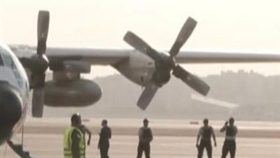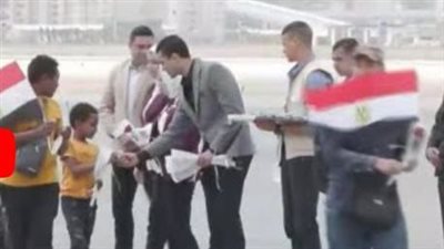 لحظة وصول مجموعة جديدة من المصريين القادمين من السودان، حيث استقبل المصريين العائدون من السودان بالورود وأعلام مصر، في قاعدة شرق القاهرة