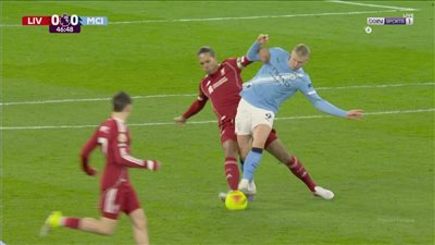 قطع قميص محمد صلاح بعد شد قوي من مدافع مانشستر سيتي في الدقيقة 68، والحكم يحتسب خطأ ويشهر البطاقة الصفراء في قمة الدوري الإنجليزي.