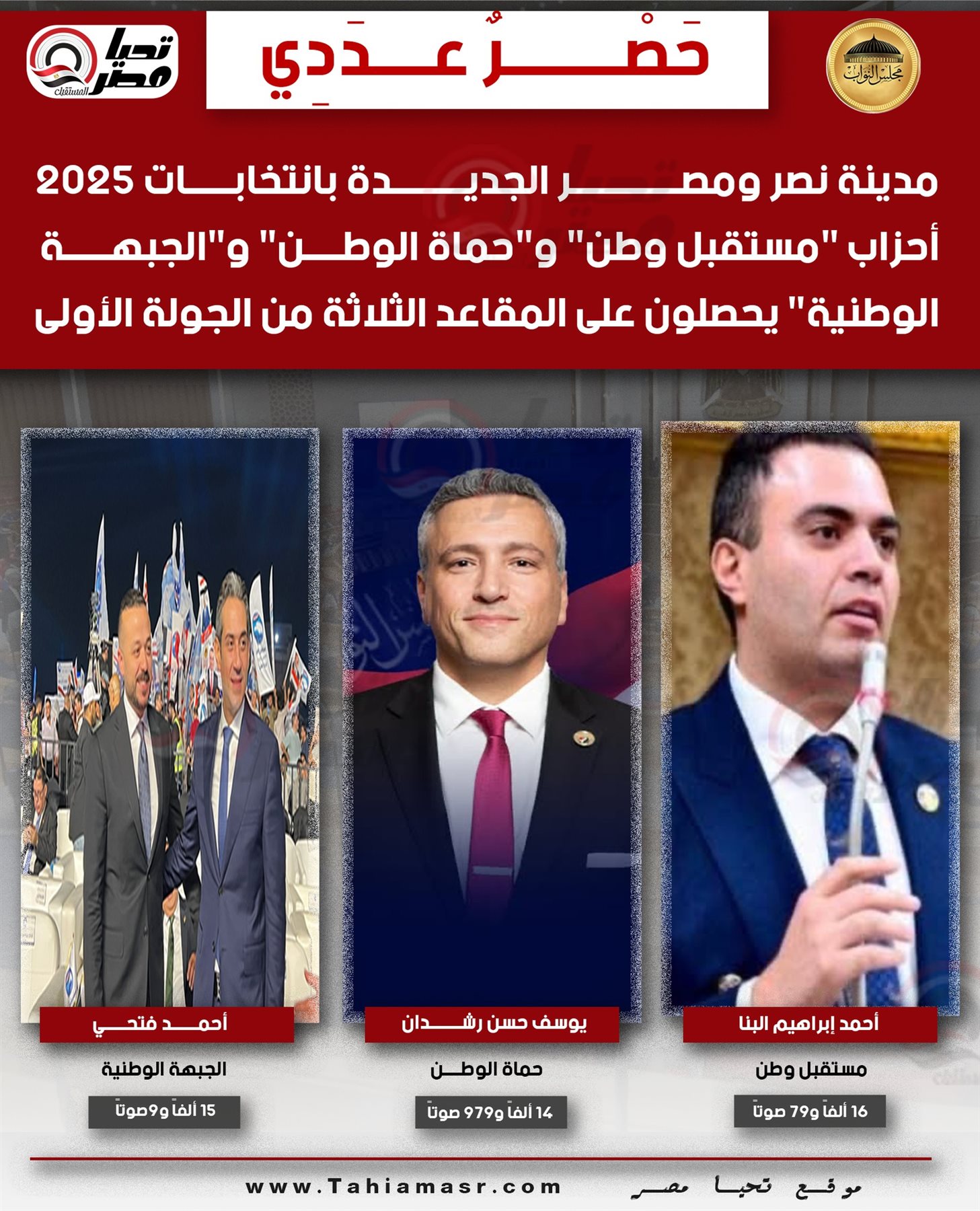 حَصْرٌ عَدَدِي - مدينة نصر ومصر الجديدة.. أحزاب "مستقبل وطن" و"حماة الوطن" و"الجبهة الوطنية" يحصلون على المقاعد الثلاثة من الجولة الأولى