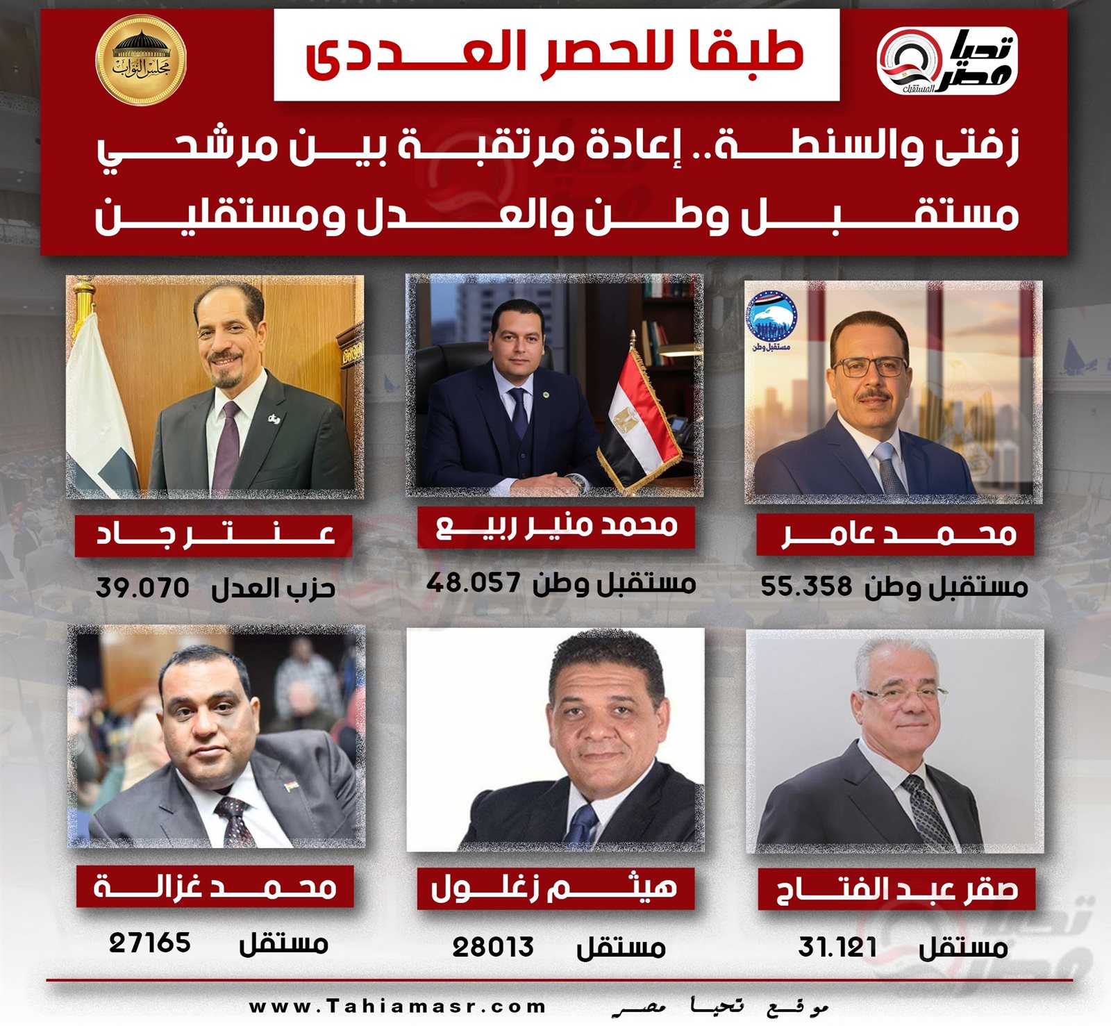 وحصل مرشح حزب مستقبل وطن محمد عامر على 55358 صوتا، كما حصل المرشح الثاني لمستقبل وطن محمد منير ربيع على 48057 صوتا، فيما حصل مرشح حزب العدل عنتر جاد على 39070 صوتا، بينما حصل المرشح المستقل صقر عبد الفتاح على 31121 صوتا، فيما حصل المرشح المستقل الأخر هيثم زغلول على 28013 صوتا، والمرشح المستقل الأخير محمد غزالة حصل على 27165 صوتا ويتنظرهم جميعًا جولة إعادة من أجل تحديد مقاعد الدائرة الثلاثة داخل البرلمان الجديد.