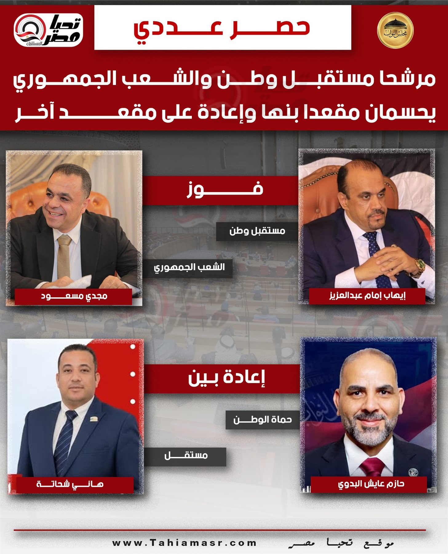 حصر عددي.. مرشحا مستقبل وطن والشعب الجمهوري يحسمان مقعدي بنها وإعادة على مقعد آخر