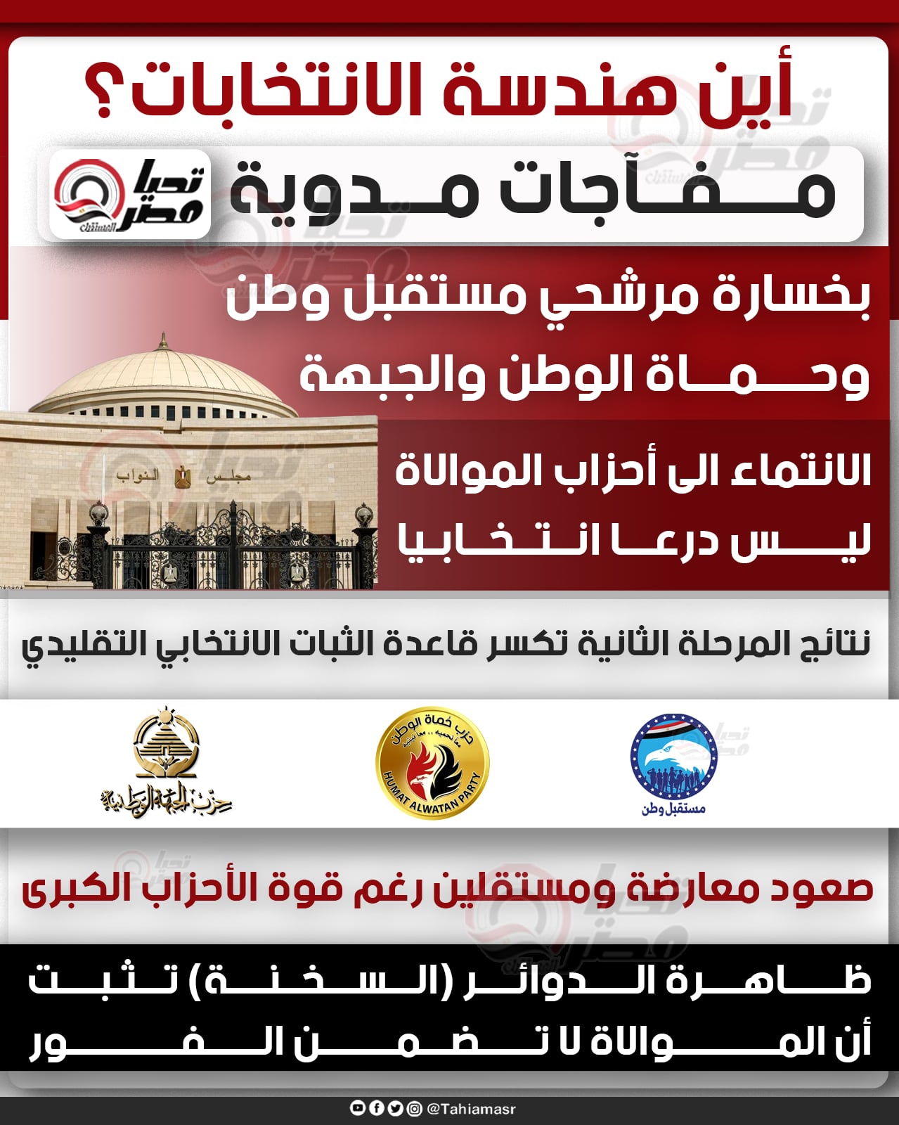 لم يقتصر هذا التحول على دائرة واحدة او محافظة بعينها، بل امتد ليطال مرشحين بارزين ينتمون الى احزاب الموالاة في اكثر من منطقة. فقد خسر مرشح حزب حماة الوطن عبد الله خالد مصطفى في دائرة المرج، رغم نشاط حزبه واتساع قاعدته التنظيمية، كما خسر مرشح حزب مستقبل وطن احمد الالفي في الغربية، وهي دائرة لطالما مالت للحزب في جولات سابقة.