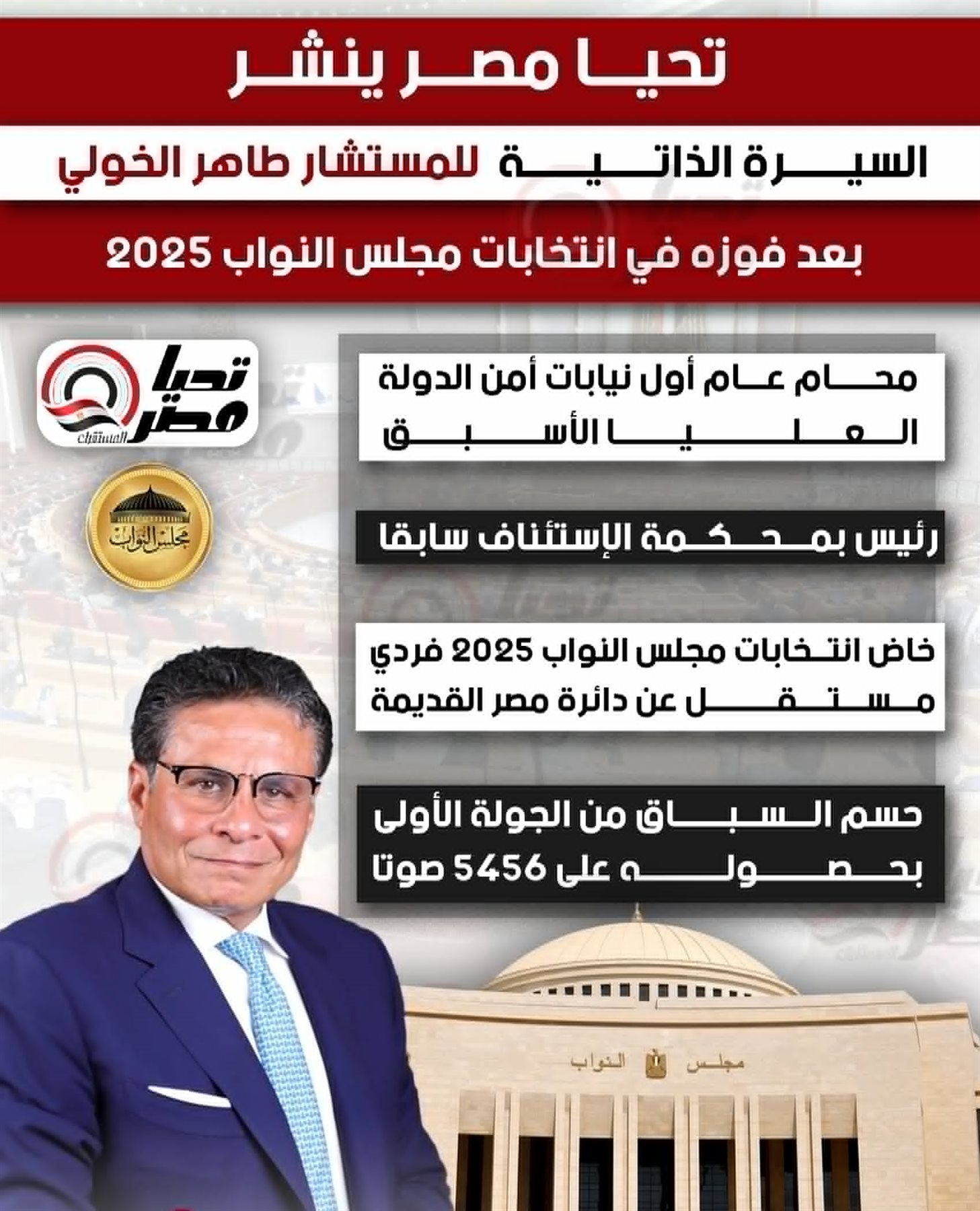 وجه المستشار طاهر الخولي نائب دائرة مصر القديمة والمنيل ، رسالة شكر وتقدير لجميع الجهات المشاركة في إنجاح العملية الانتخابية ، وذلك بعد إعلان الهيئة الوطنية للانتخابات فوزه في الإنتخابات البرلمانية نائبا عن دائرة مصر القديمة والمنيل ۲٠٢٥ - ۲۰۳۰ ، اليوم في مؤتمر صحفي إعلان نتائج المرحلة الثانية للانتخابات البرلمانية.