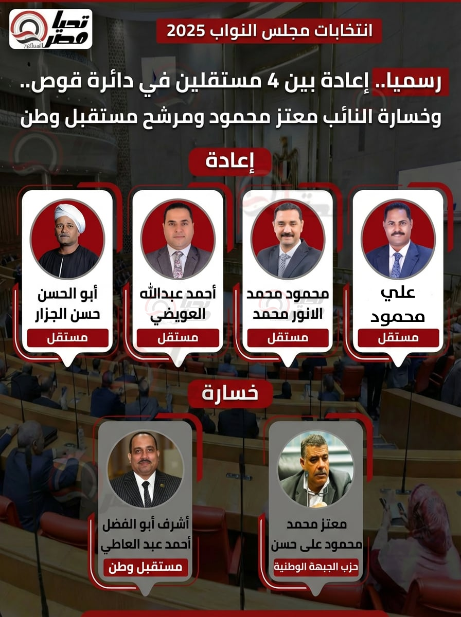 رسميا.. إعادة بين 4 مستقلين في دائرة قوص.. وخسارة النائب معتز محمود ومرشح مستقبل وطن