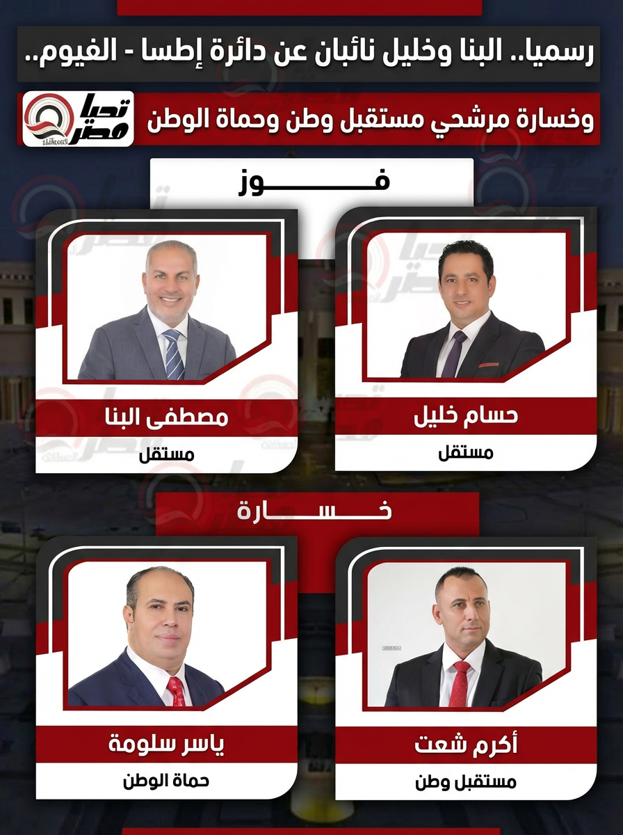 رسميا.. البنا وخليل نائبان عن دائرة إطسا - الفيوم.. وخسارة مرشحي مستقبل وطن وحماة الوطن