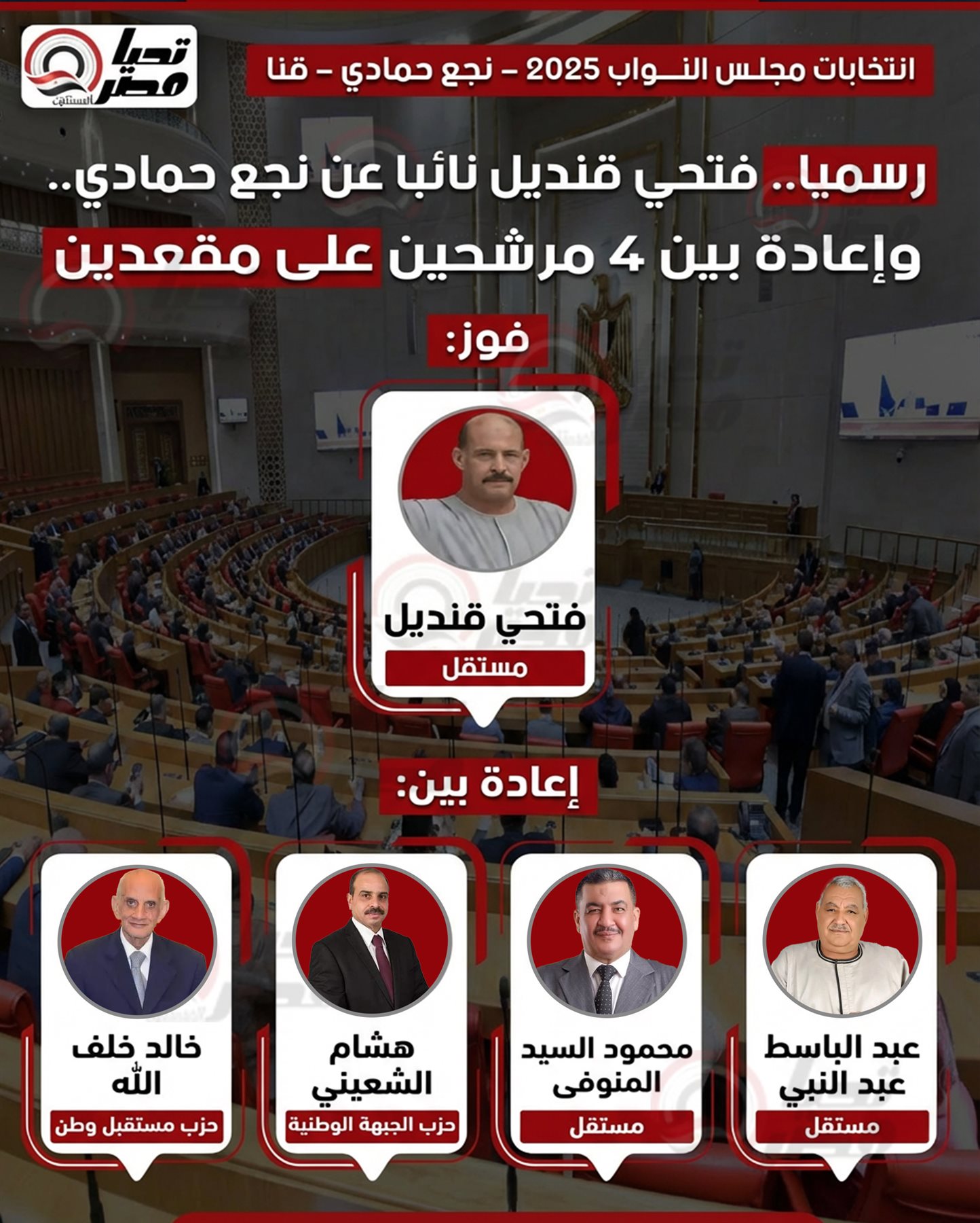 رسميا.. فتحي قنديل نائبا عن نجع حمادي.. وإعادة بين 4 مرشحين على مقعدين