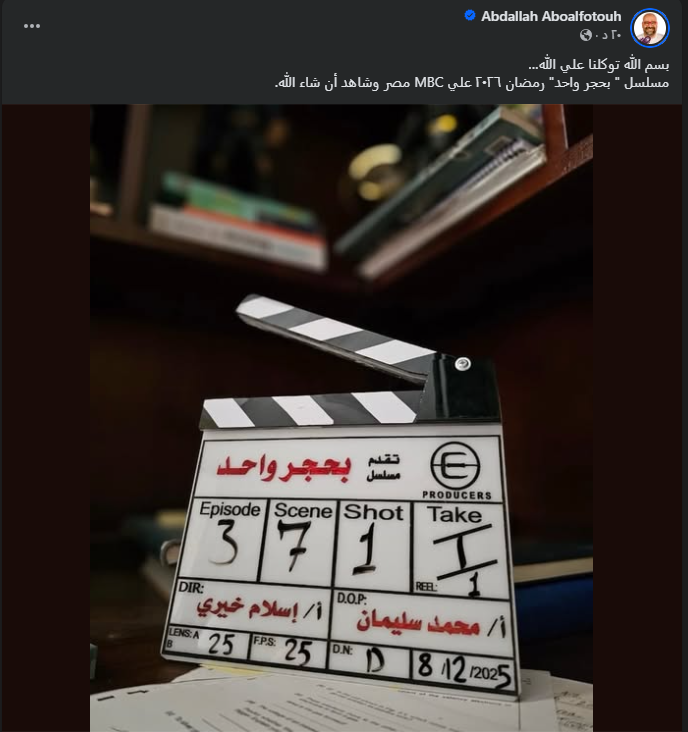 وشارك المنتج عبدالله أبو الفتوح، صورة لكلاكيت مسلسل بحجر واحد، وفقا لما رصده موقع تحيا مصر، عبر صفحته الرسمية على موقع التواصل الاجتماعي فيسبوك، وعلق عليها: بسم الله توكلنا علي الله، مسلسل بحجر واحد، رمضان ٢٠٢٦ علي MBC مصر وشاهد أن شاء الله.