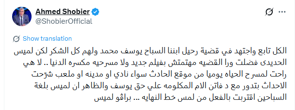 تحيا مصر، وكتب أحمد شوبير عبر حسابه الرسمي"فيس بوك":" الكل تابع واجتهد في قضية رحيل ابننا السباح يوسف محمد، ولهم كل الشكر لكن لميس الحديدى فضلت ورا القضية مهتمتش بفيلم جديد ولا مسرحية مكسره الدنيا".
