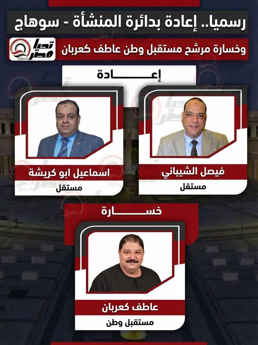 رسميا.. إعادة بدائرة المنشأة - سوهاج وخسارة مرشح مستقبل وطن عاطف كعربان