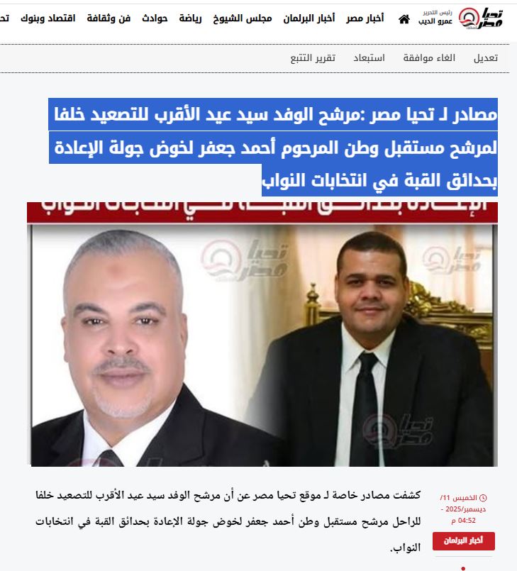 وكانت قد كشفت مصادر خاصة لـ موقع تحيا مصر عن أن مرشح الوفد سيد عيد الأقرب للتصعيد خلفا للراحل مرشح مستقبل وطن أحمد جعفر لخوض جولة الإعادة بحدائق القبة في انتخابات النواب.