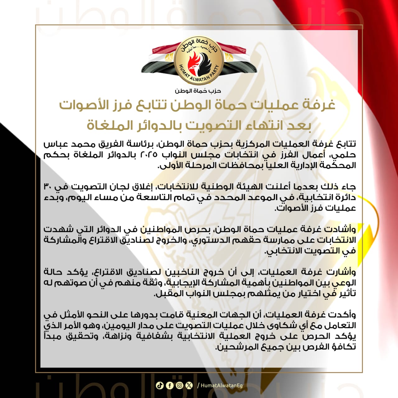 تابعت غرفة العمليات المركزية بحزب حماة الوطن، برئاسة الفريق محمد عباس حلمي، أعمال الفرز في انتخابات مجلس النواب 2025 بالدوائر الملغاة بحكم المحكمة الإدارية العليا بمحافظات المرحلة الأولى.