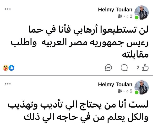 وفي ظل هذا الجدل، خرج حلمي طولان بتصريح مثير قال فيه: "لن تستطيعوا إرهابي فأنا في حماية رئيس جمهورية مصر العربية، وأطلب مقابلة الرئيس".