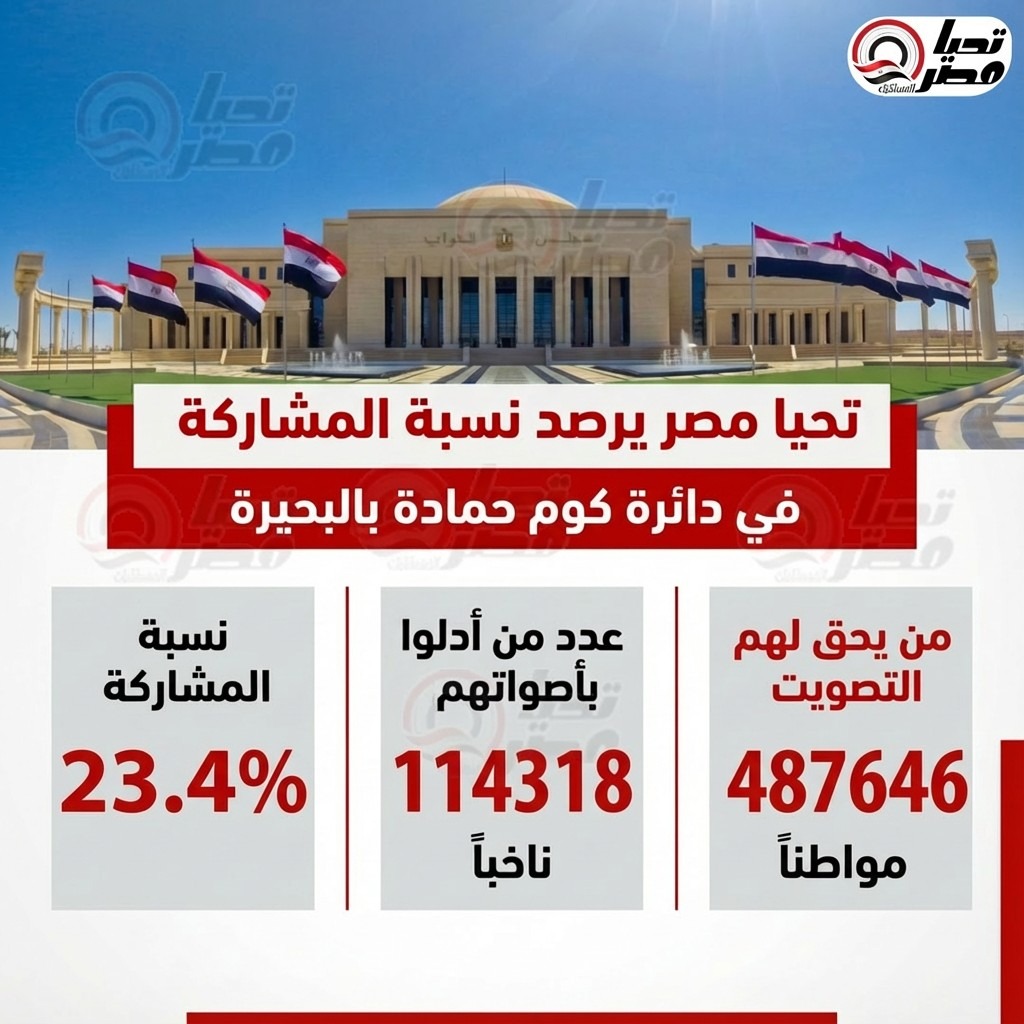 في دائرة كوم حمادة، بلغ عدد المواطنين الذين يحق لهم الإدلاء بأصواتهم 487,646 مواطنا، وشارك فعليًا 114,318 ناخبًا في العملية الانتخابية، لتصل نسبة المشاركة إلى 23.4%، وهو ما يعكس مستوى إقبال متوسطًا ومستقرًا من الناخبين داخل الدائرة.