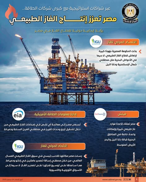 نشر المركز الإعلامي لمجلس الوزراء عددًا من الإنفوجرافات عبر منصاته على مواقع التواصل الاجتماعي، سلط من خلالها الضوء على جهود الدولة لتعزيز إنتاج الغاز الطبيعي عبر شراكات استراتيجية مع كبرى شركات الطاقة.