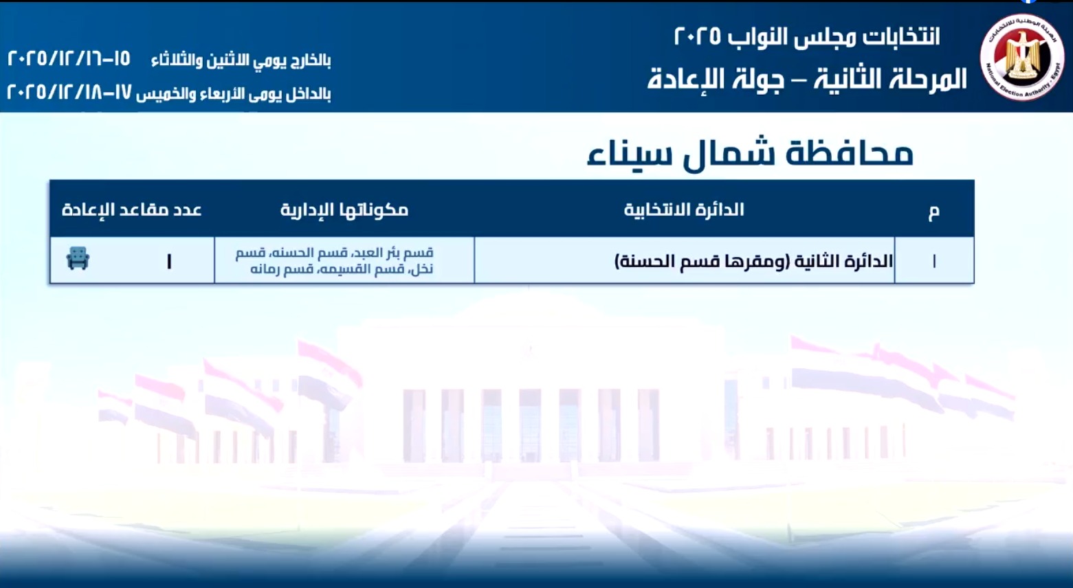 وفي السياق ذاته، تخوض محافظة شمال سيناء جولة الإعادة على مقعد فردي واحد أيضًا، وذلك في الدائرة الثانية ومقرها قسم الحسنة، والتي تشمل أقسام: بئر العبد، والحسنة، ونخل، والشيخ زويد، ورفح.