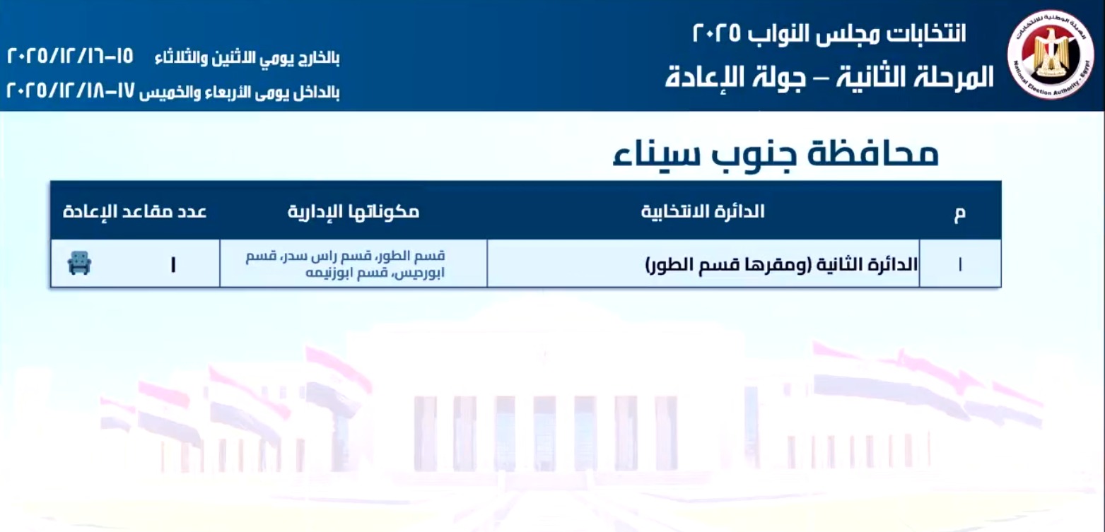 وتشهد محافظة جنوب سيناء جولة الإعادة على مقعد فردي واحد، حيث تجرى الإعادة في الدائرة الثانية ومقرها قسم الطور، والتي تضم أقسام: الطور، ورأس سدر، وأبو رديس، وأبو زنيمة.