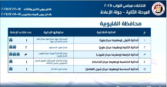 وتجرى جولة الإعادة لانتخابات مجلس النواب بمحافظة القليوبية في 5 دوائر وهما مقسمين كالتالي: