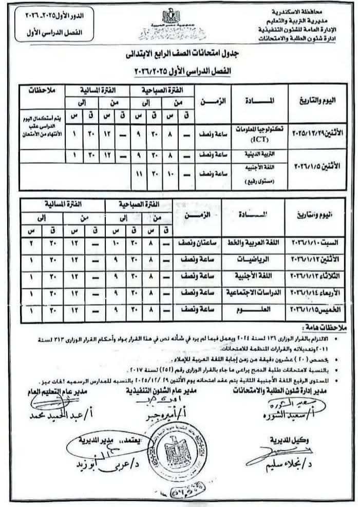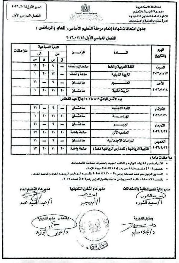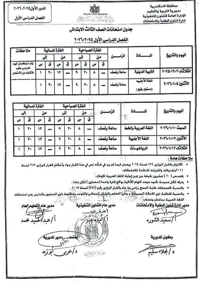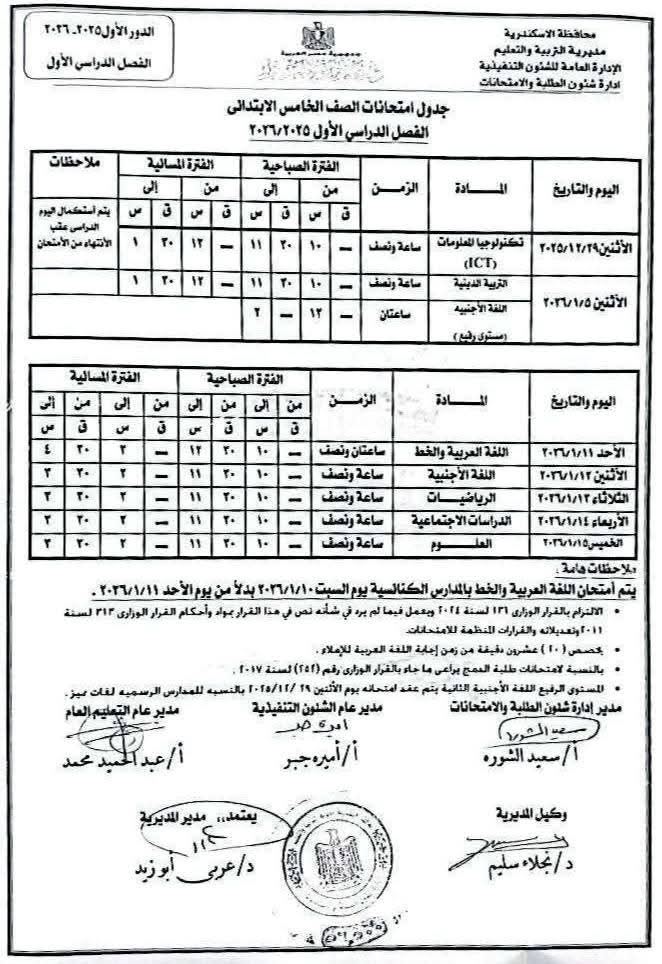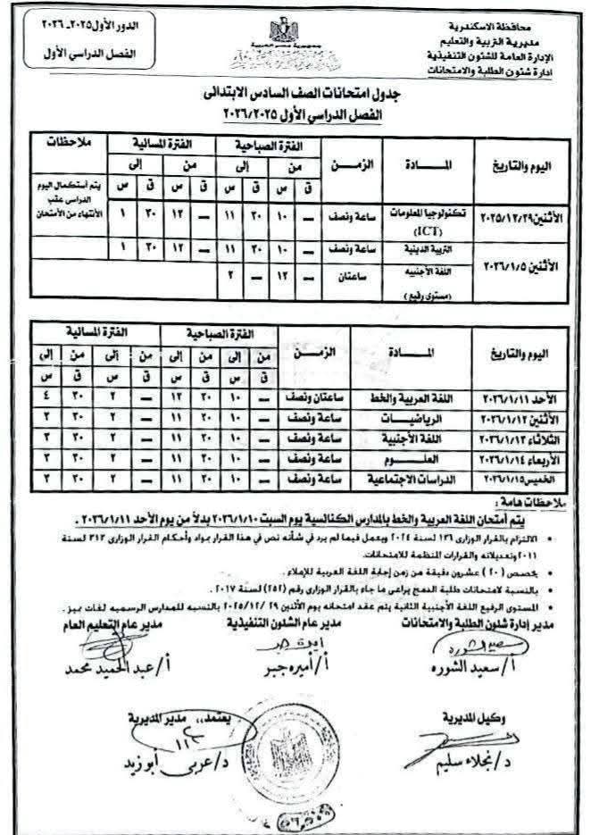 ووفقًا للجدول المعتمد من محافظة الإسكندرية، تبدأ امتحانات الفصل الدراسي الأول يوم 29 ديسمبر 2025، وتستمر حتى 22 يناير 2026، لكافة الصفوف الدراسية بمراحل التعليم المختلفة.