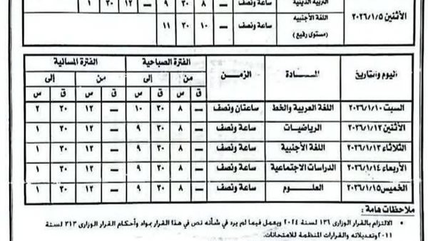 كما تقرر أن تُعقد امتحانات المواد غير المضافة للمجموع خلال الفترة من 29 ديسمبر 2025 وحتى 5 يناير 2026، على أن تُستكمل باقي الامتحانات وفق الجداول المحددة لكل مرحلة تعليمية.