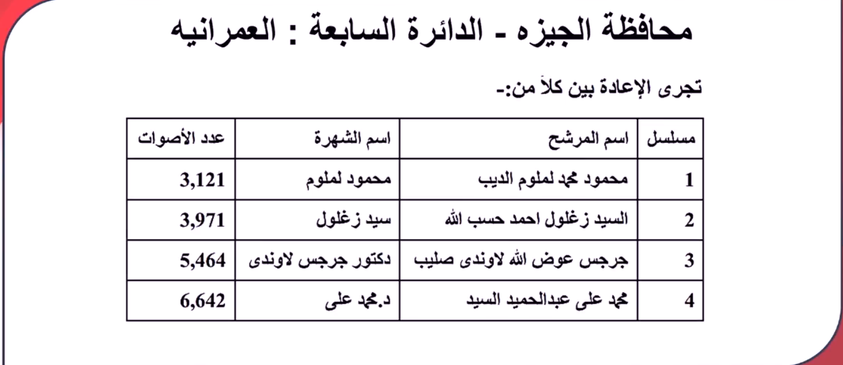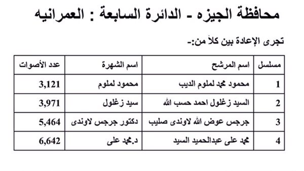 وأعلنت الهيئة الوطنية للانتخابات عن دخول الإعادة كلا من: