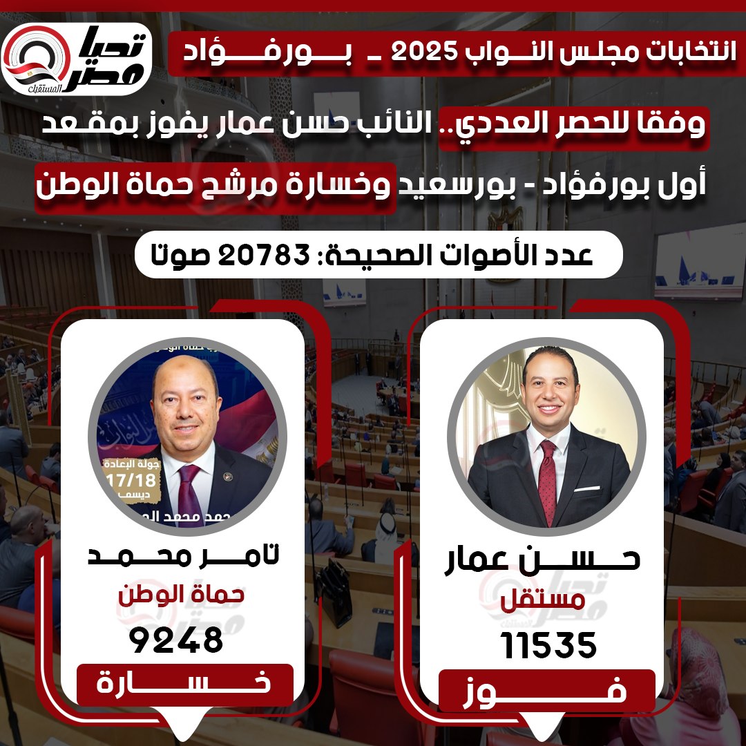 وفقا للحصر العددي.. النائب حسن عمار يفوز بمقعد أول بورفؤاد في بورسعيد وخسارة مرشح حماة الوطن