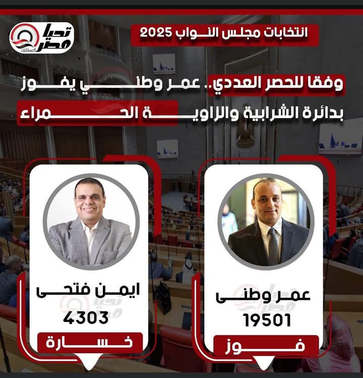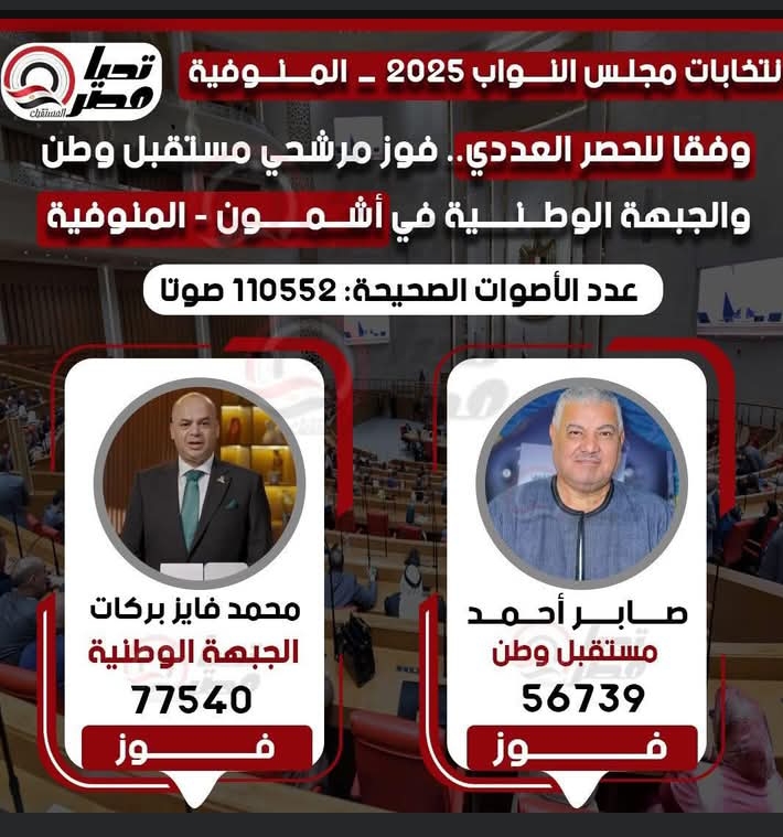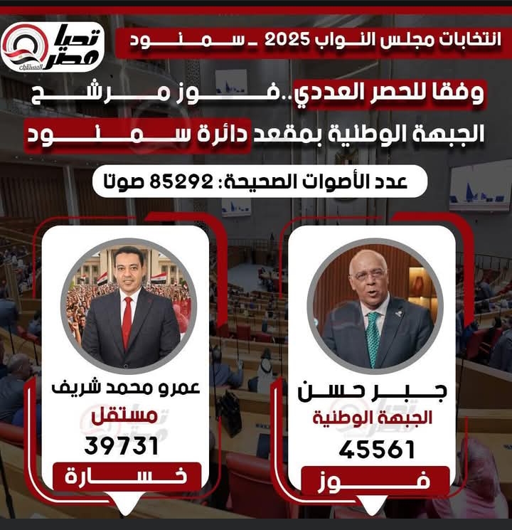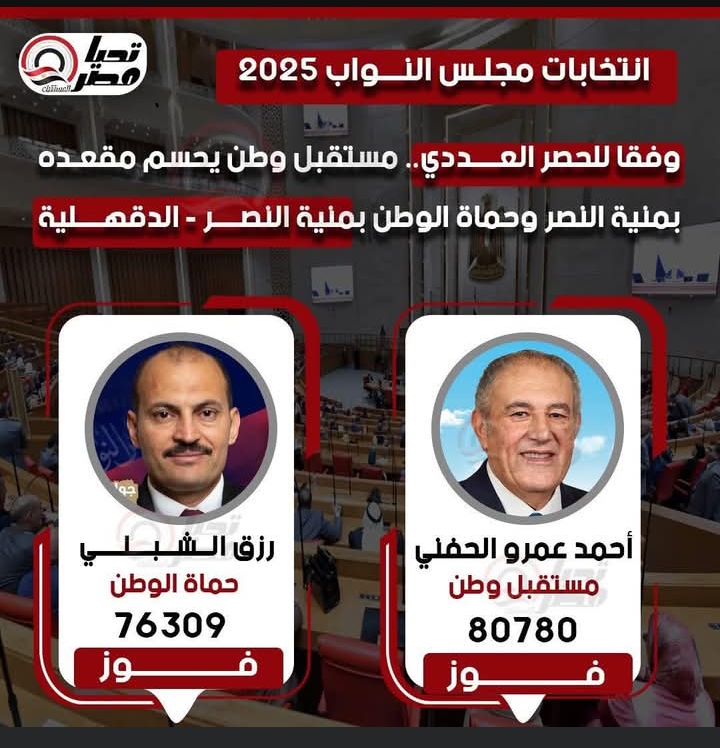 أما دائرة أبو النمرس والحوامدية، ففاز بها حسام عاشور بـ 35600 صوتاً ومحمد رشاد البرتقالي بـ 32100 صوتاً عن حزب مستقبل وطن.