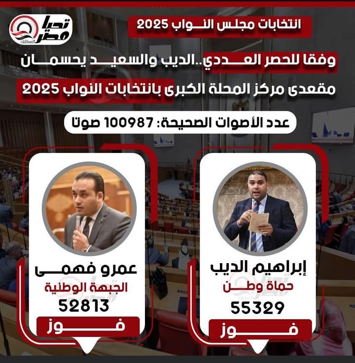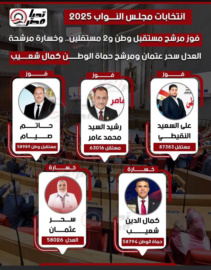 كما حسم محمد بدوي الدسوقي مقعد دائرة الجيزة كمستقل بـ 22800 صوتاً، ومنتصر رياض بنفس الدائرة عن مستقبل وطن بـ 21400 صوتا.