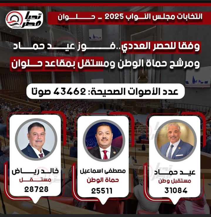 وفي البساتين فاز حشمت أبو حجر بـ 21300 صوتاً وعلي عبد العال بـ 18900 صوتاً (مستقبل وطن). وحسم عيد حماد مقعد حلوان عن حزب مستقبل وطن بـ 28650 صوتاً.