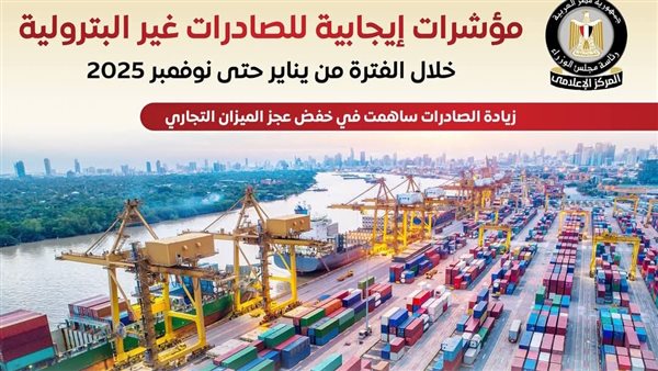 نشر المركز الإعلامي لمجلس الوزراء، عددًا من الإنفوجرافات عبر منصاته على مواقع التواصل الاجتماعي، استعرض من خلالها المؤشرات الإيجابية للصادرات غير البترولية خلال الفترة من يناير حتى نوفمبر 2025.