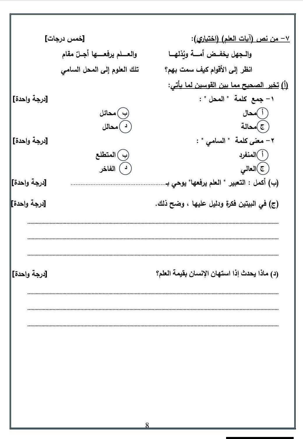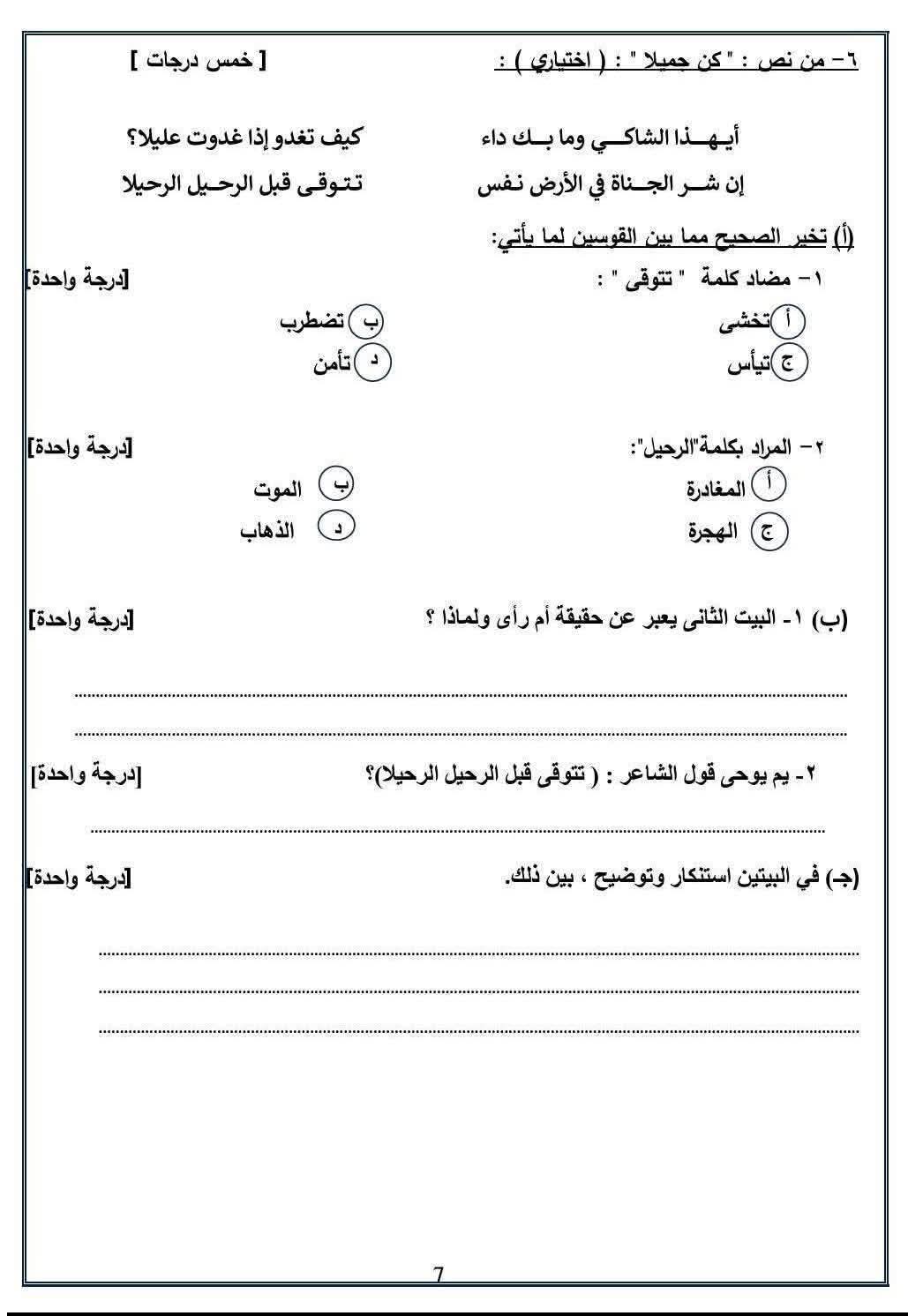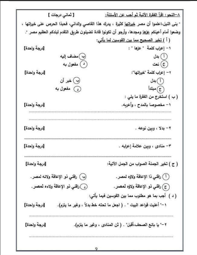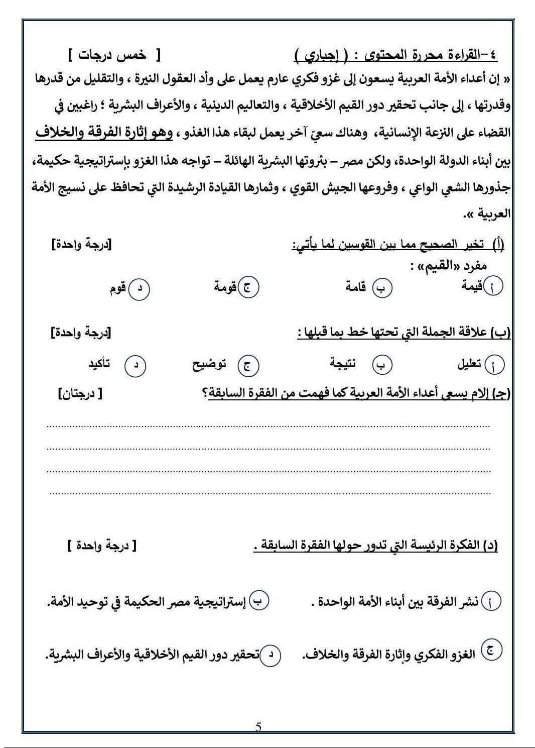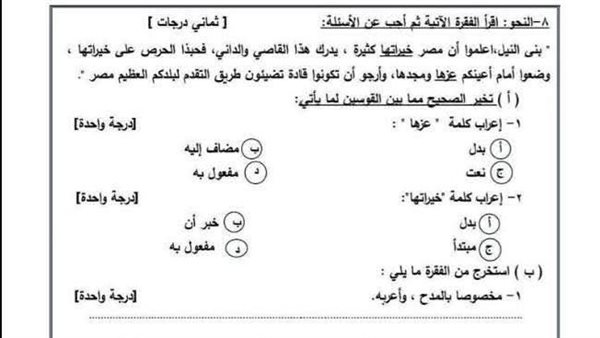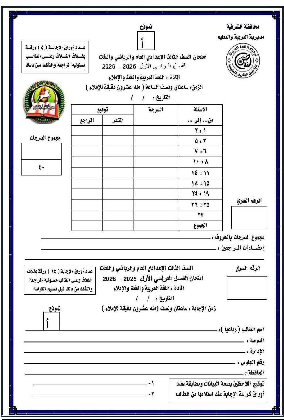 - نموذج امتحان اللغة العربية للصف الثالث الإعدادي 2026