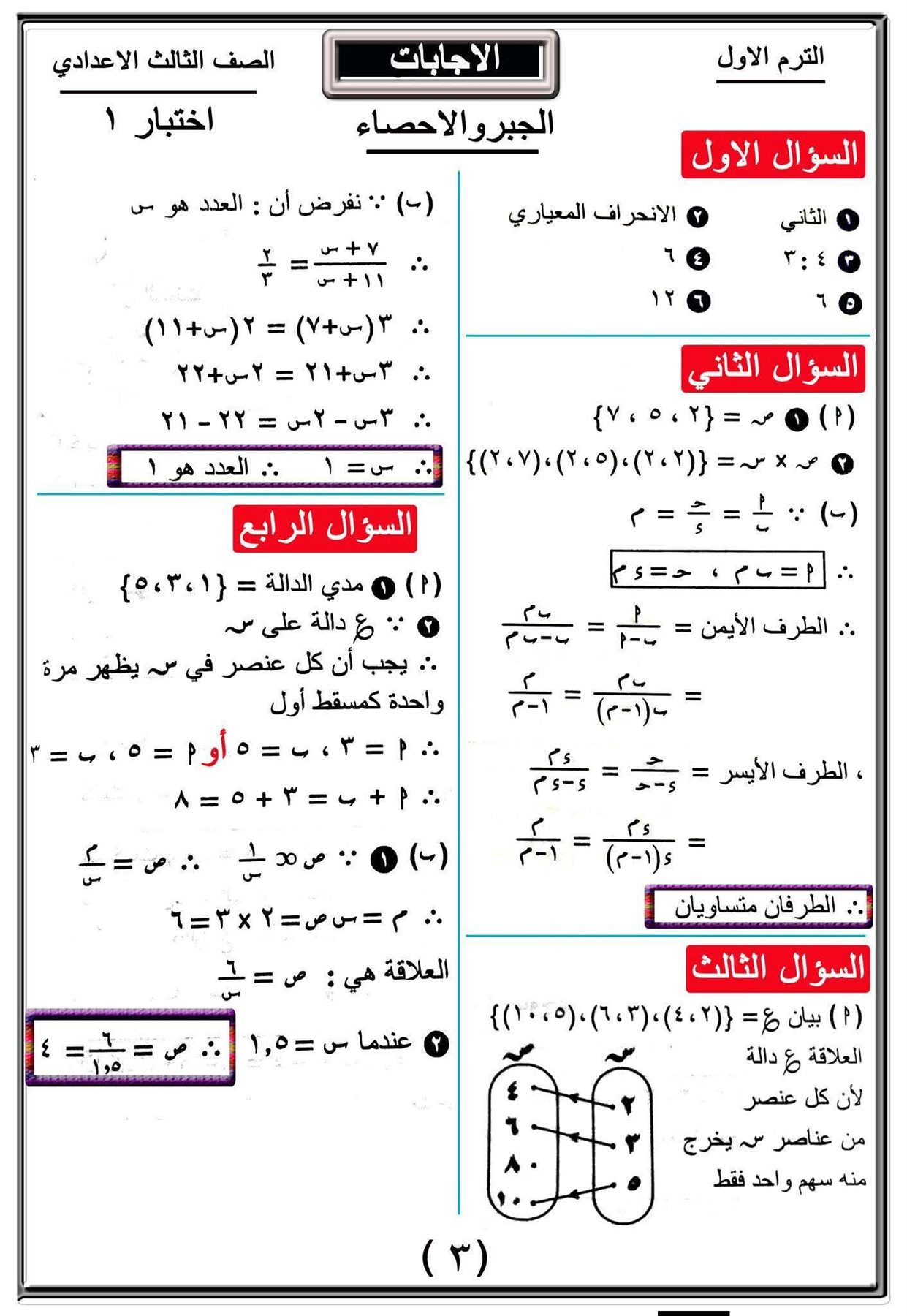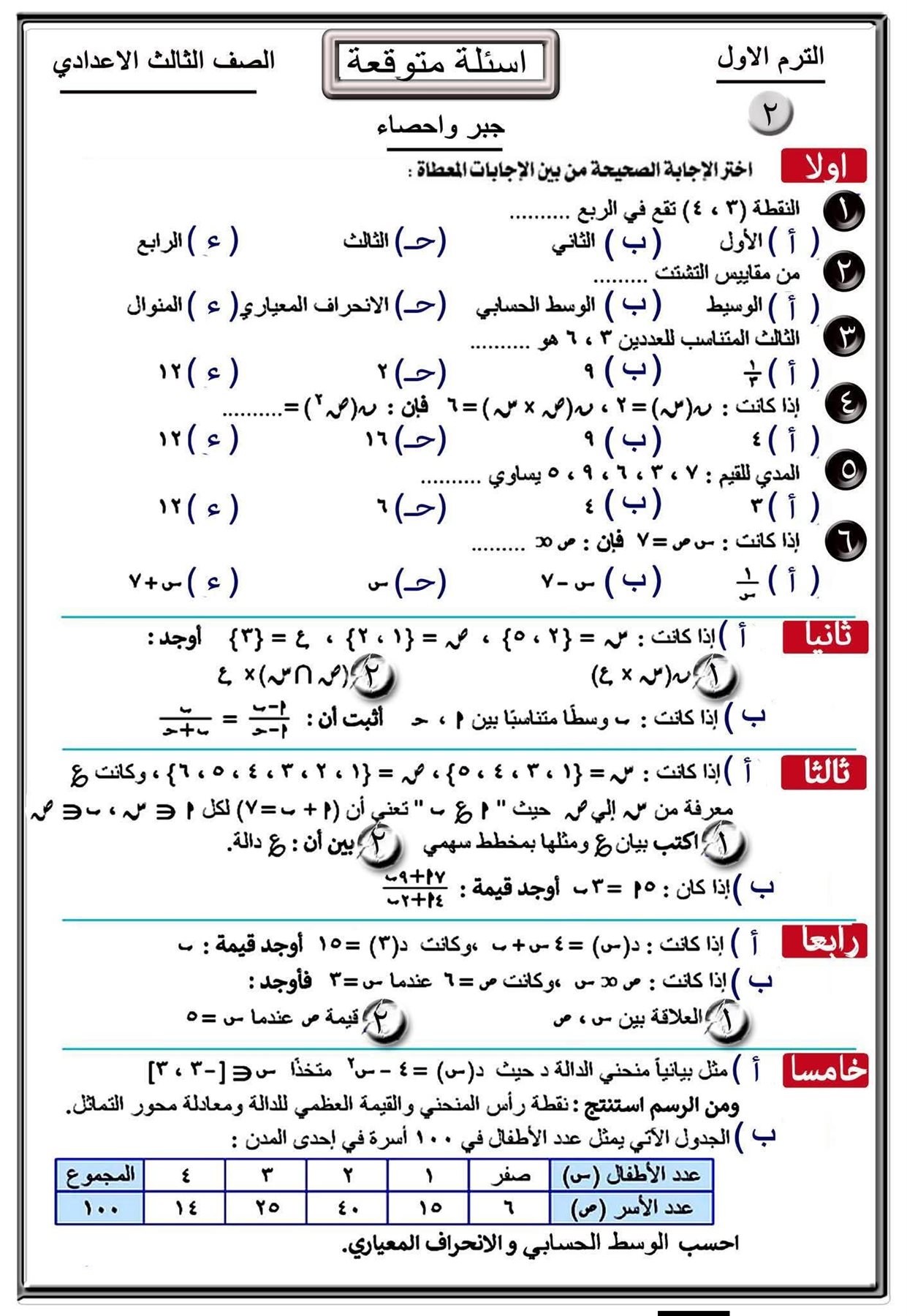 أسئلة متوقعة في الجبر والإحصاء للصف الثالث الإعدادي