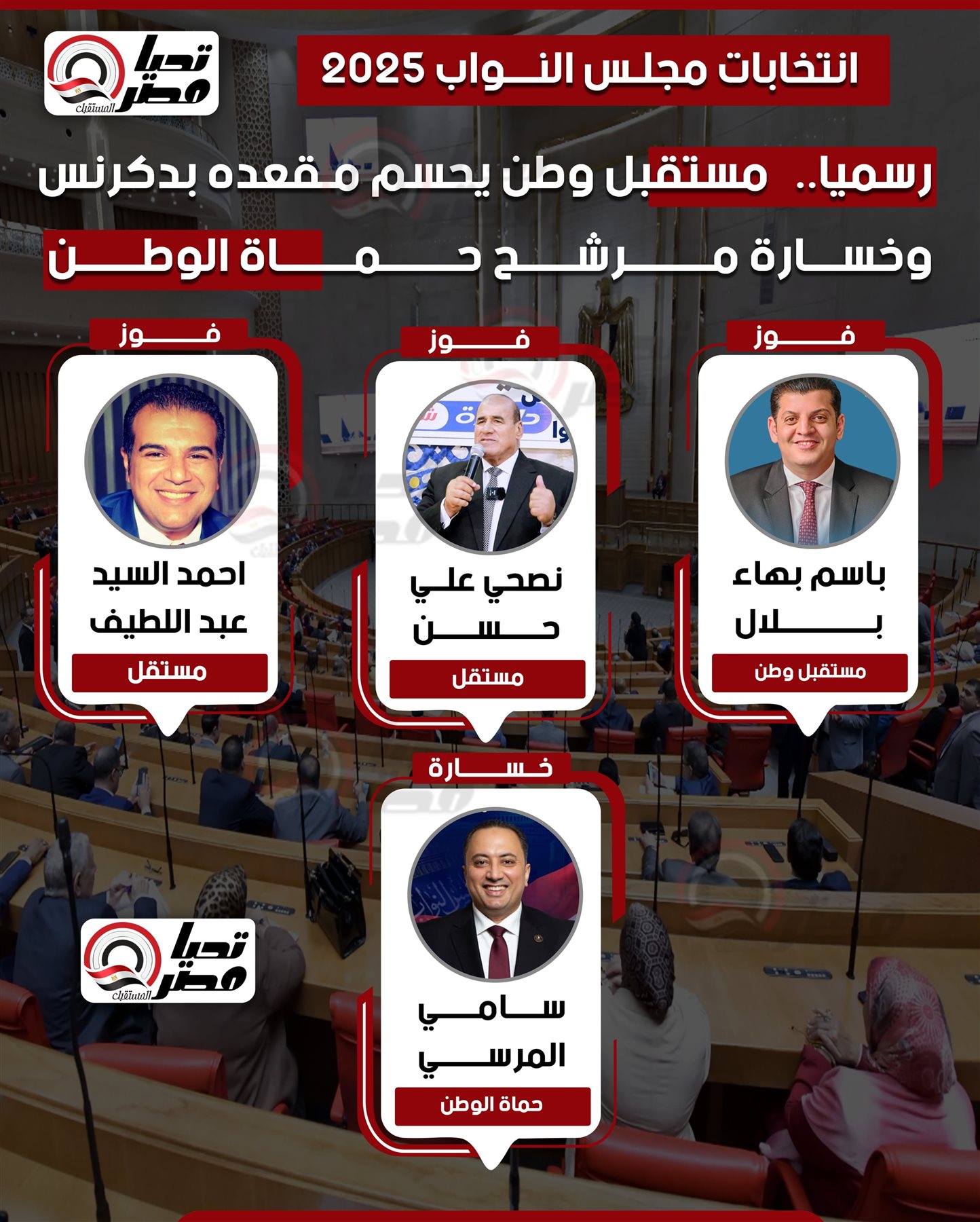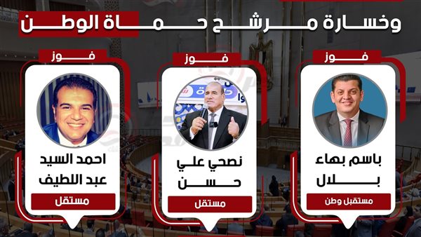 أعلن القاضي حازم بدوي رئيس الهيئة الوطنية للانتخابات عن فوز المرشح باسم بهاء بلال مرشح حزب مستقبل وطن، و المرشح المستقل نصحي علي حسن ، والمرشح المستقل الأخر أحمد السيد عبد اللطيف، بينما أسفرت النتيجة الرسمية عن خسارة مرشح حماة الوطن سامي المرسي.