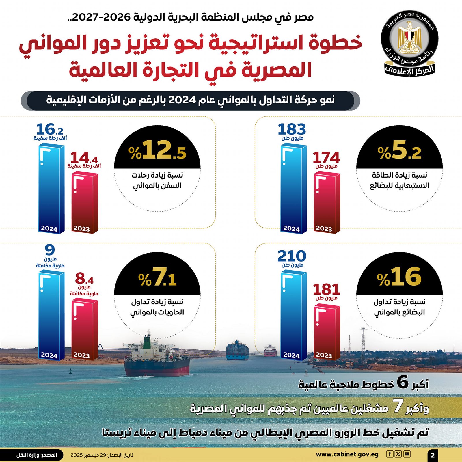 وأشارت الإنفوجرافات إلى أنه نجاح الدولة في جذب أكبر 6 خطوط ملاحية عالمية، و7 من أكبر مشغلي المواني عالميًا للعمل بالمواني المصرية، فضلًا عن تشغيل خط الرورو المصري - الإيطالي من ميناء دمياط إلى ميناء تريستا.