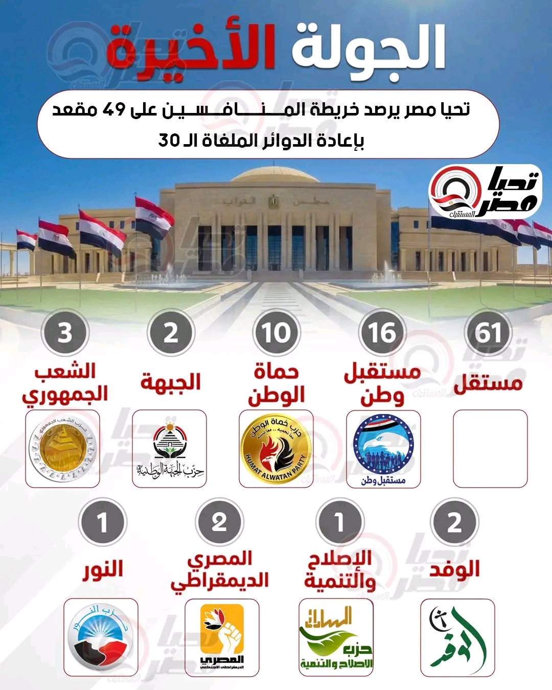 الجولة الأخيرة.. تحيا مصر يرصد خريطة المنافسين على 49 مقعد بإعادة الدوائر الملغاة الـ 30